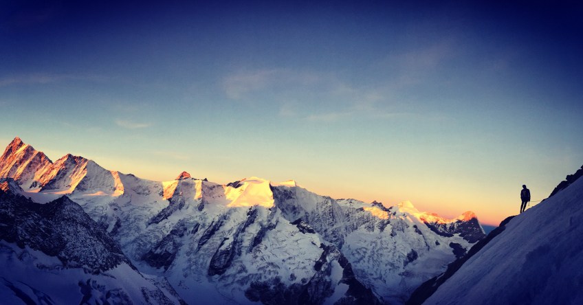 Published septembre 29, 2015 at 4096 × 2145 in Schreckhorn, Oberland, Arête Sud Ouest La rimaye est passée, plus qu’à remonter le couloir de neige pour rejoindre ensuite l’arête et son rocher bien compact.