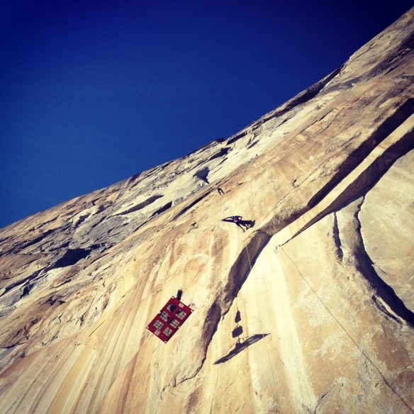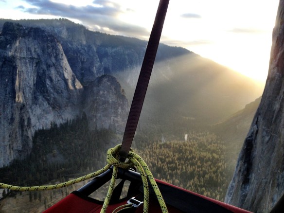 Jeudi 10. Il fait bien frais et pour cause, il a neigé au sommet de half-dome. Mais le soleil va vite venir réchauffer la face. Les rituels du matin sont finis, Vanessa a remis sa sellette et est prête à partir. Elle n’est pas fatiguée physiquement des longueurs qu’elle fait. En fait Vanessa randonne chaque montée de corde, on voit qu’elle a la marge et que ses heures à s’entraîner se concrétisent ici. C’est plus les efforts autour qui demandent de l’energie. Se mettre sur le portaledge à chaque relais. Se mettre dans le duvet, glisser le matelas dessous son corps, aller au bord du portaledge pour les toilettes, etc etc…  Mais comme je l’ai dit plus haut, il faut faire une chose après l’autre, calmement.