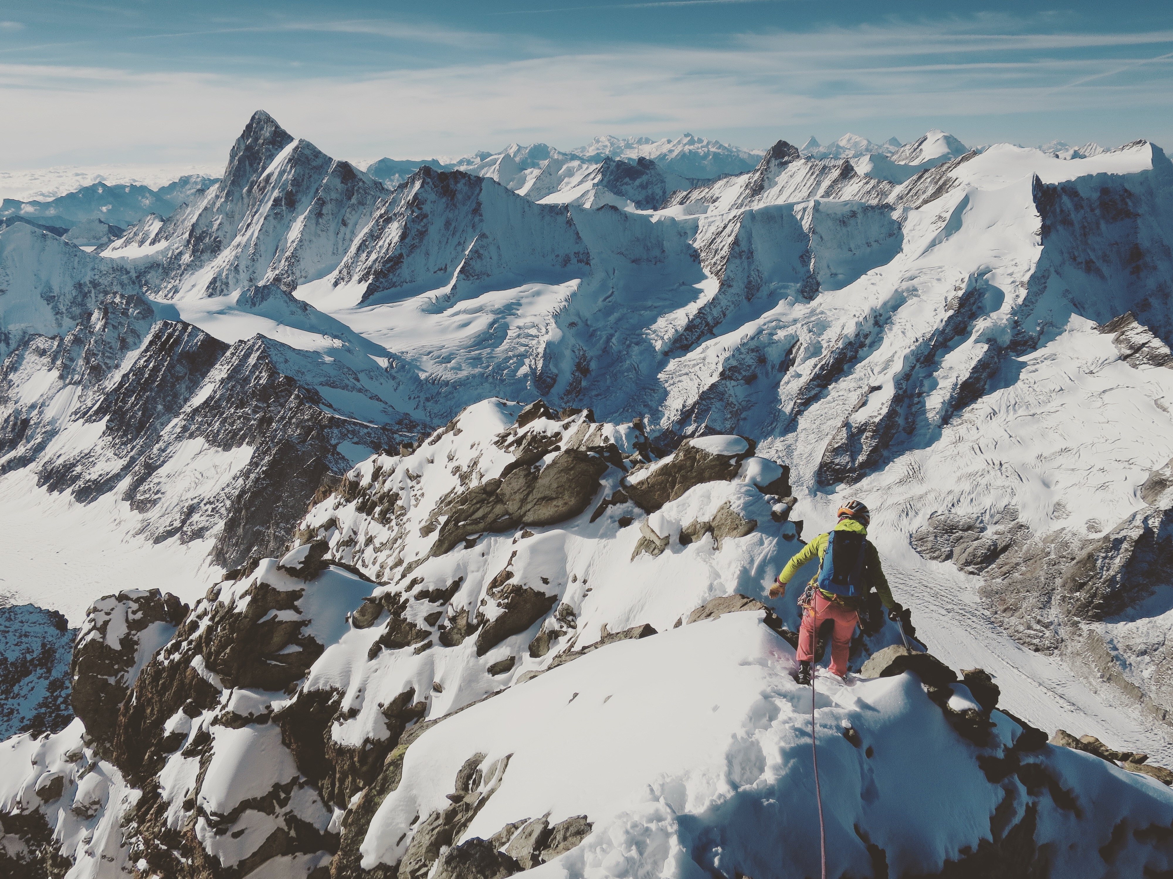 Dimanche, 4h du mat, c’est le départ. Descente de la moraine, traversée du glacier, remontée un peu plus loin. Il y a pas mal de kairns au début et une sente assez bien marquée qui disparait peu à peu avec la neige. La marche de nuit passe toujours assez vite et l’on se retrouve déjà sur le glacier. Il y a plus de neige que ce que nous pensions et le bout de trace laissé par la cordée de la veille est bien apprécié. Nous passons la rimaye par la droite, là où elle est bouchée et remontons le couloir à droite de l’arête, suffisamment enneigé. Enfin nous arrivons au rocher. Un rocher orangé compact aux grosses prises franches. Le type de rocher rassurant et facile à grimper. Au niveau condition, il y a de la neige (ça on l’avait compris dès l’approche) mais ça ne gêne pas vraiment. On va juste un peu plus doucement que si c’était sec. L’arête qui mène du Schreckhorn au Lauteraarhorn est bien enneigée aussi. L’enchaînement sera pour une autre fois, ce qui fait une autre bonne raison de revenir :)