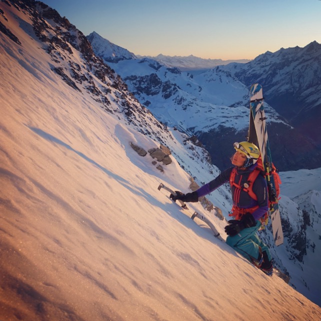 Jeudi 5 Mai, Hornli 4h du mat, c’est le départ. On commence par glisser, puis cacher les duvet, les peaux et autre matériel dont on ne va pas avoir besoin sous un gros rocher avant d’entamer la suite, crampons au pied. Il y a pas de mal de neige jusqu’à la rimaye et l’on s’enfonce bien. Avec Giulia on se partage la trace et ça nous demande quand même un bon petit effort. La rimaye passe tranquille et à partir de là ca se redresse bien. J’aime bien ces départs à la frontale, je trouve que ça passe toujours assez vite. Et plus on monte plus le soleil se lève et plus c’est beau. C’est toujours magique ces belles ambiance, ces lumières du matin, ces montagnes à perte de vue et ce sentiment d’être un petit rien au milieu d’une grosse face. Ca remplit de belles émotions et d’images ineffaçables.