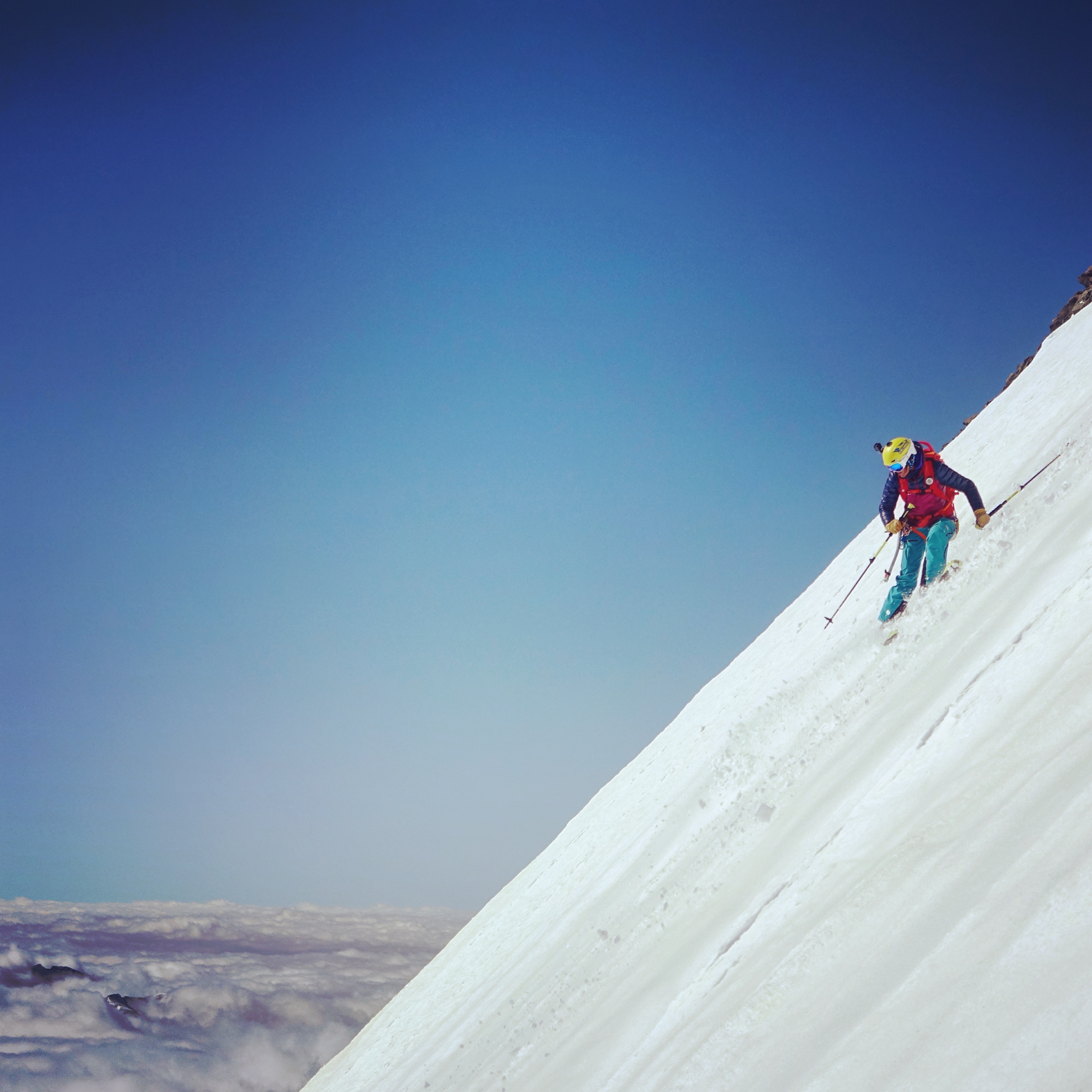 C’est Giulia qui ouvre le bal, elle fait son premier virage direct et enchaine. Solide. Je sens que je vais avoir besoin de déraper un peu pour sentir la neige avant de faire ce premier virage, souvent libératoire. Lorraine et Melissa sont à l’aise elles aussi. Elles assurent tout en étant relax. Au fur et à mesure que l’on descend la pente est moins raide et la neige vraiment bonne et la descente est vraiment classe. On reste vigilantes quand même, il y a toujours quelques requins malveillants cachés sous la neige et même si la pente est moins raide la chute reste interdite. Je vis cette descente intensément et j’en prends plein les sens. C’est incroyable d’être là, toutes les quatre avec une pure complicité au milieu de cette immense face, sur cette montagne si spéciale.