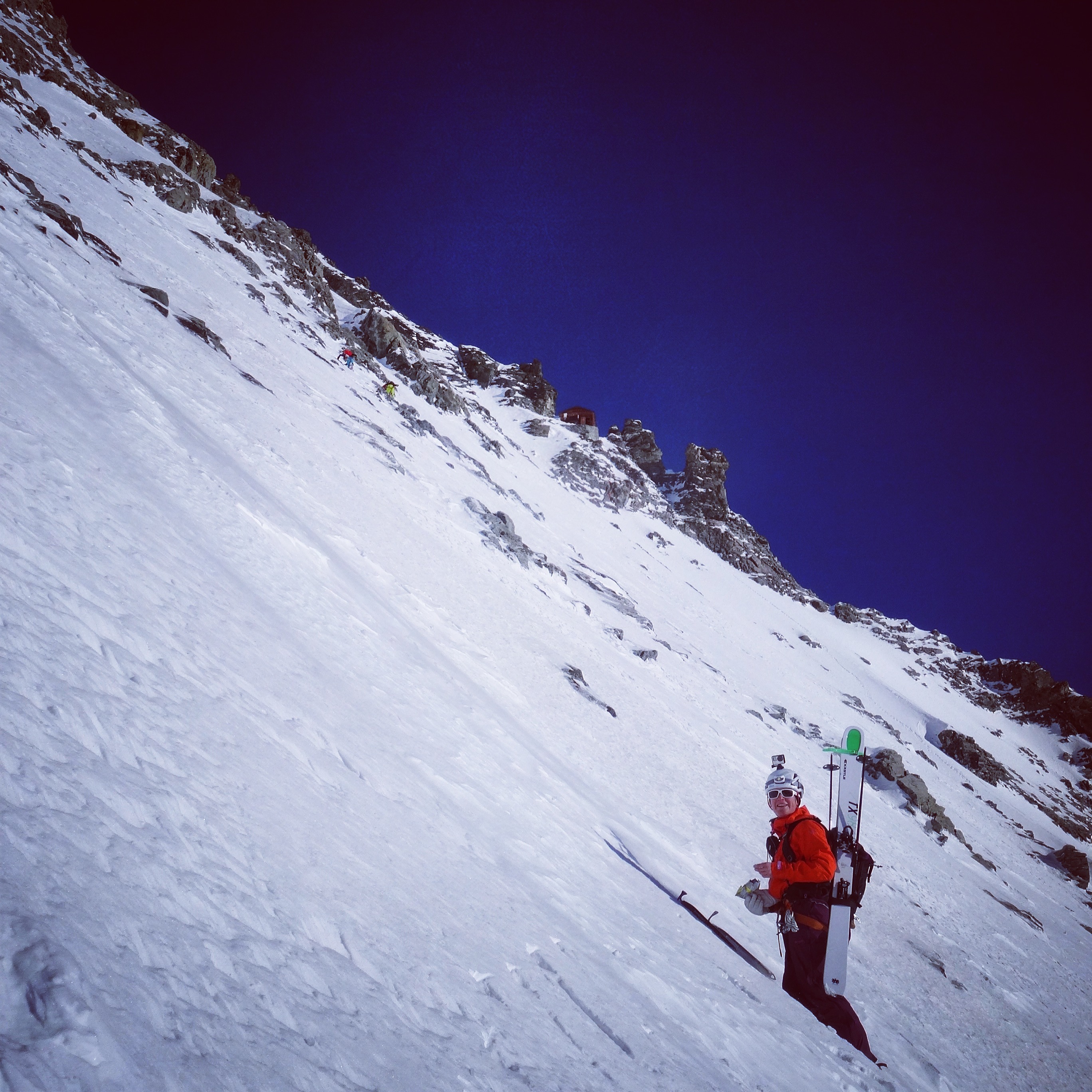 From there, we skin up toward the Chardonnet pass, on a typical spring morning hard snow. This year, I decided to reduce the size of my skis and the weight of my gear. Except for the few really good powder days, I have done all my alpine days with the Rocca Freebird, 75 under foot, and I had lots of fun and lots of confidence with a small but real ski. Same thing with the boots, I now use the Syborg a lot that weight less than a paire of Baturas… after a few times you get use to ski them just like any bigger boots.