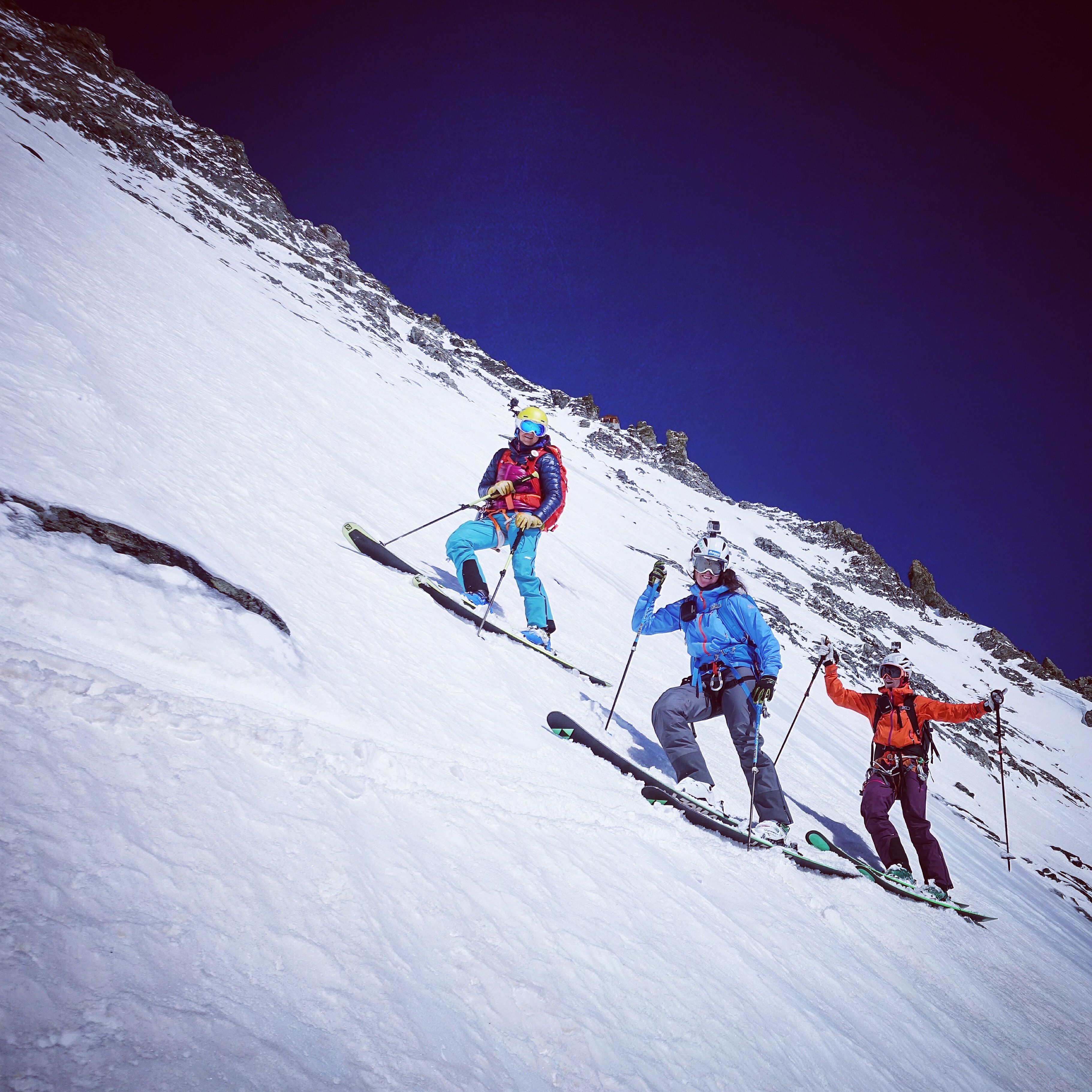 - Lorraine, Mél et moi sous Solvay. La neige est top et l’on profite pleinement de cette descente. ©Giulia Monego